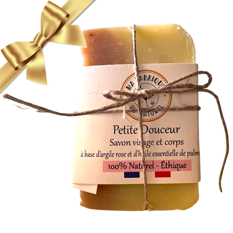 INCI : sodium olivate*, sodium sheabutterat*, sodium cocoat*, aqua, sodium sunflower seedate*, glycerin, kaolin*, cymbopogon martini oil*, géraniol**, linalol**, citral**, farnesol**